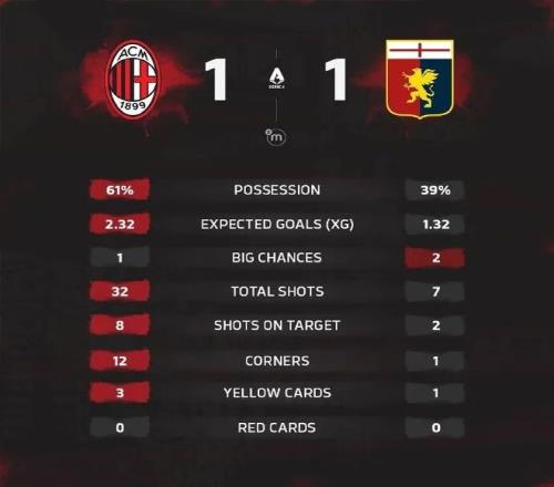 全场比赛结束,米兰1-1热那亚。